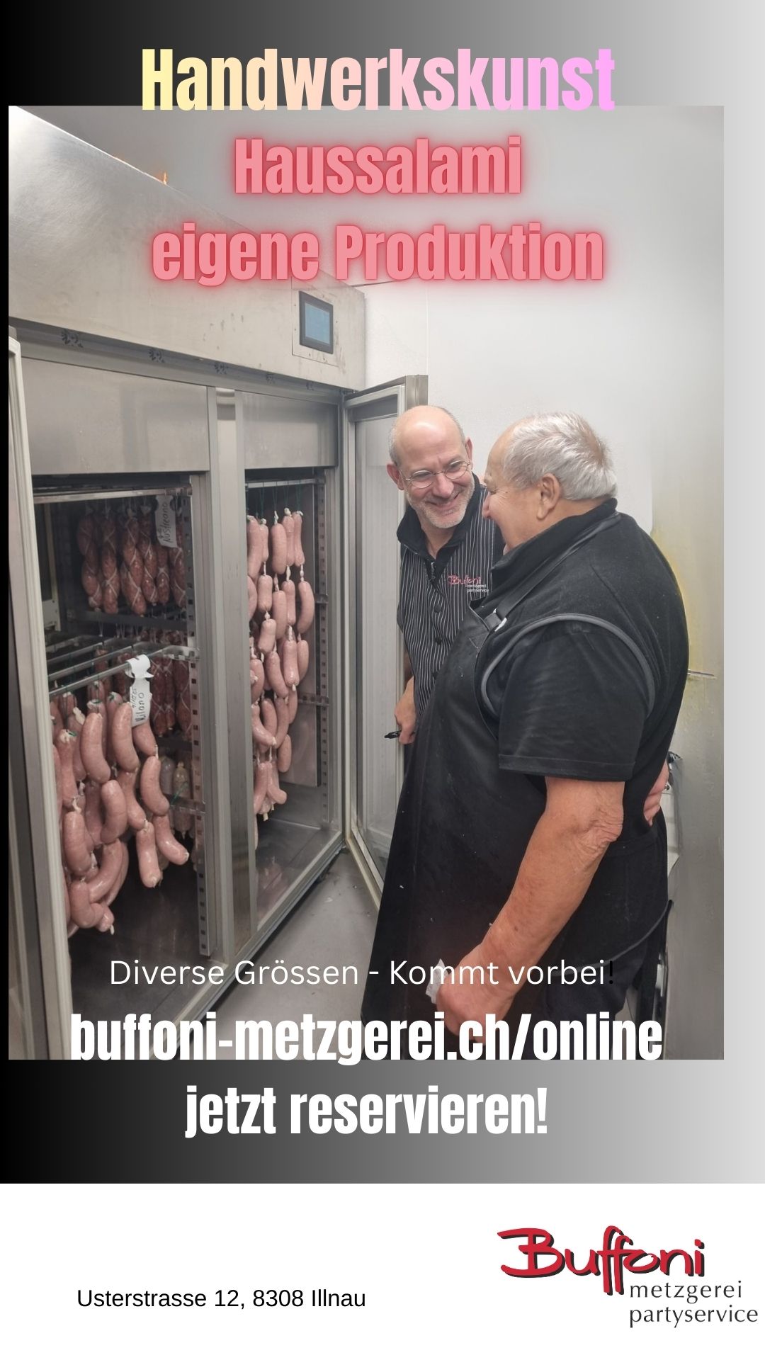 Möchten Sie einen Salami für sich reservieren oder verschenken? Dann nutzen Sie unser Bestellungs-Tool online “www.metzgerei-buffoni.ch/online” und geben Sie unter “Individuelles” die Anzahl Haussalamis sowie Grösse an.