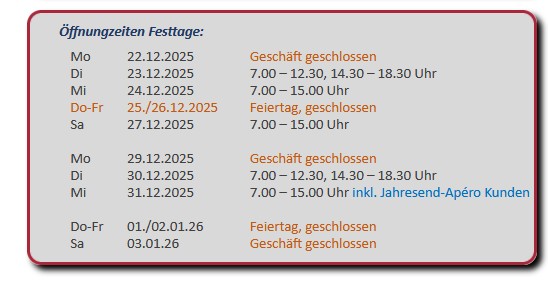 Bitte beachten Sie unsere Öffnungszeiten zwischen Weihnachten und Neujahr.